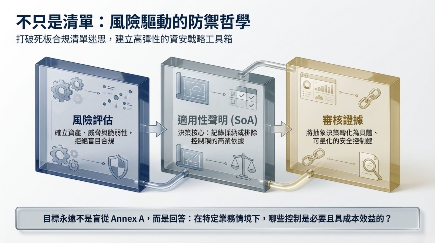 Annex A強調的是「風險導向」(risk-based approach),而不是一刀切的合規清單。這意味著組織必須先完成對資產、威脅與弱點的風險評估,才能合理地選擇Annex A中適用的控制,並在聲明適用性中說明決策依據。風險導向的實作要求不只是形式化的選擇流程,還包括風險接受標準的建立、控制效益與成本的衡量、以及持續的驗證與改進,確保每項被採用的控制有其風險降低的明確目的(CTI-CERT, n.d.)。
