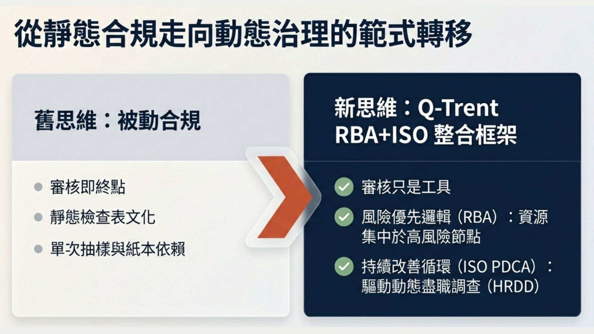 在實作上,驅勢國際管理顧問 (Q-Trent) 建議把上述KPI納入季度績效檢討,並以外部第三方抽查來驗證內部數據的真實性,以避免回到僅依賴文件與受控訪談的陷阱(第三方社會審核的常見失靈點)。