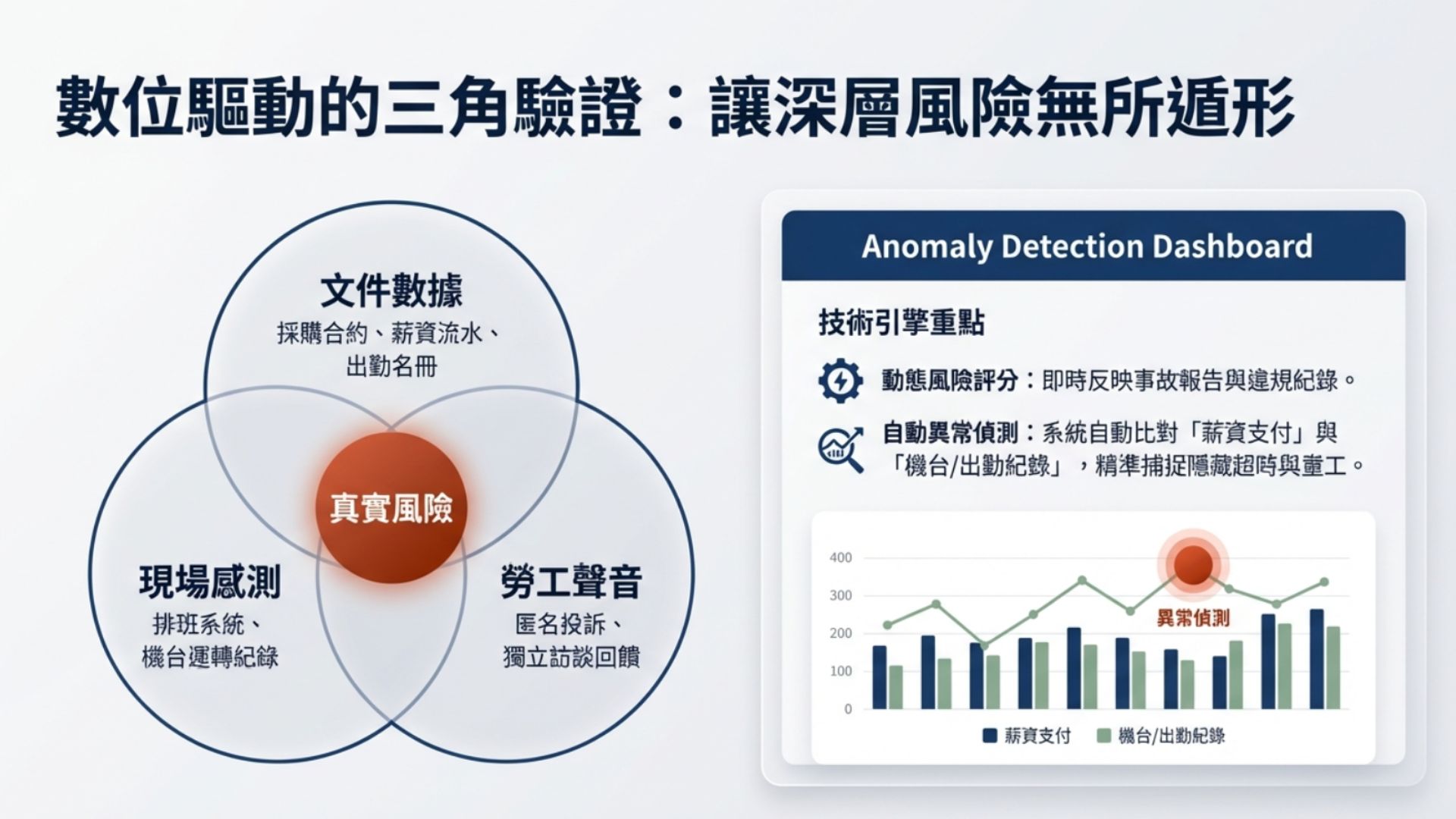 - 工人回饋管道: 投訴案件、匿名調查與通訊紀錄,作為主觀風險訊號的量化來源。