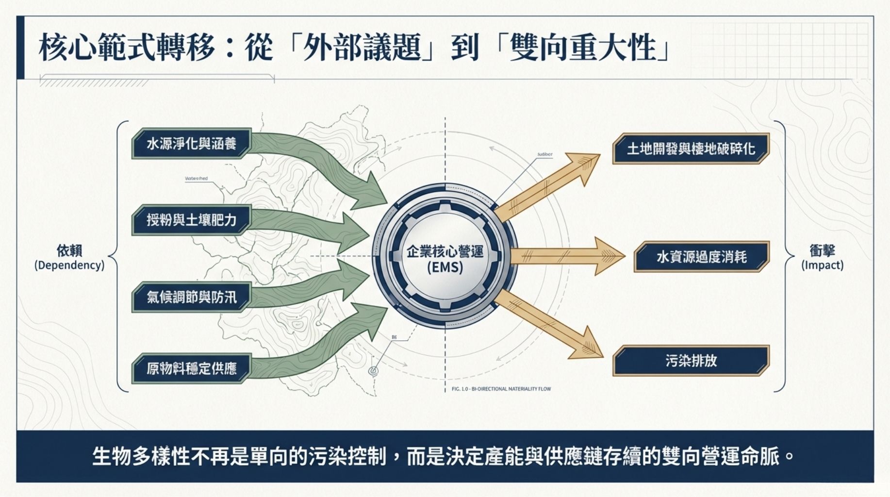 對於 EMS 而言,生物多樣性的識別必須超越單一污染源分析,採取雙向檢視:一是企業活動對生態系的直接與間接衝擊;二是企業對生態系服務(如水源、授粉、土壤肥力等)的依賴程度。有效識別需要結合空間資訊、現地生態評估與供應鏈節點分析,並納入專屬的影響-依賴矩陣以供決策(KPMG, 2026)。驅勢國際管理顧問 (Q-Trent) 建議將識別結果以風險等級與機會等級雙軸呈現,以便將有限資源導向高風險/高依賴區塊。