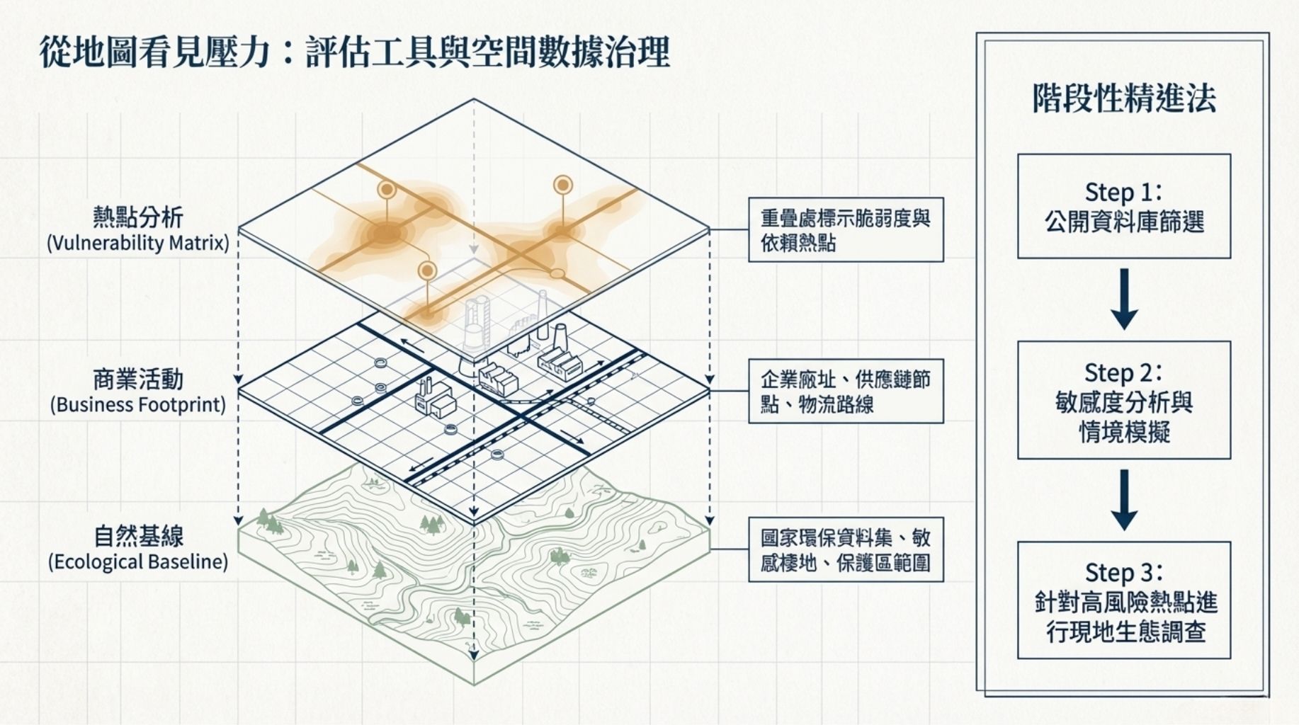 地理資訊系統(GIS)與物種/棲地模型是將企業活動定位並量化生物壓力的核心工具。透過空間化分析,可以識別工廠、設施或供應鏈節點與重要棲地的重疊,從而導出影響路徑與緩解空間措施。地方環境資料庫與政府開放資料是建立基礎資料層的首要來源(Environmental Protection Administration, 2026)。