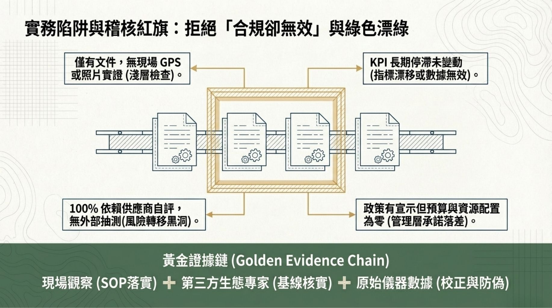 稽核過程中若發現以下紅旗,應提高後續查核強度與採取改善行動。這些紅旗常引導稽核從形式審查轉為實地調查與技術驗證。