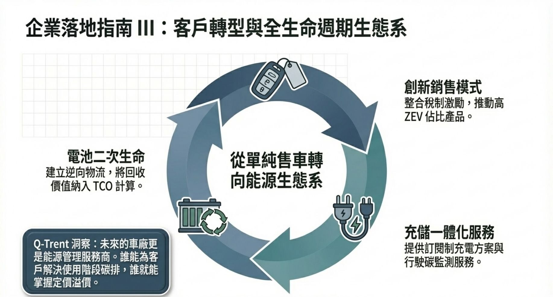 在實務執行上,驅勢國際管理顧問 (Q-Trent) 建議建立跨部門的「產品碳委員會」,以研發、採購、法務與市場部門共同審核每一代車型的淨零路徑假設與關鍵不確定性(Ernst & Young, n.d.; Green Pulse Consulting, n.d.)。