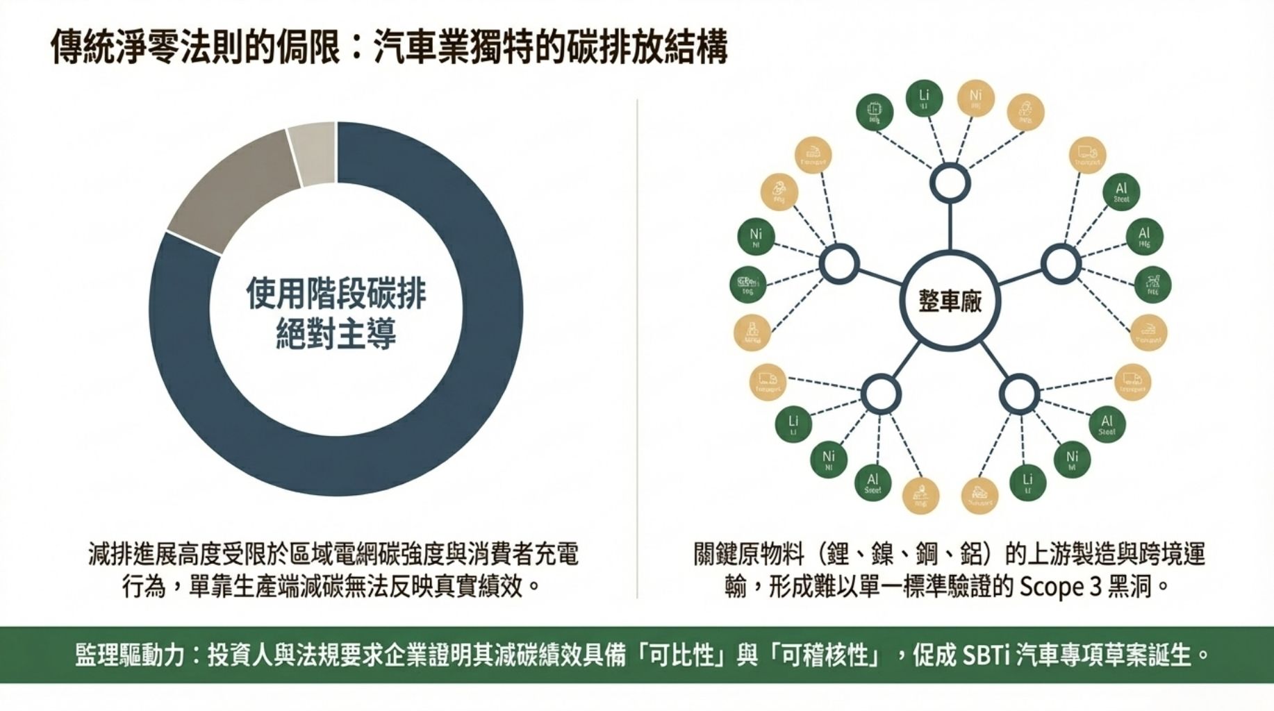 基於這些特性,產業與投資人需要一套既能反映長期運營減碳成果、又能維持可比性與可稽核性的會計規則;這正是SBTi提出汽車專項標準的核心動機之一(Green Pulse Consulting, n.d.)。驅勢國際管理顧問 (Q-Trent) 在與車廠與供應商的實務對話中觀察到,若無明確規範,企業在不同市場採用混合會計方法時會導致淨零承諾的透明度下降(King & Wood Mallesons, n.d.)。