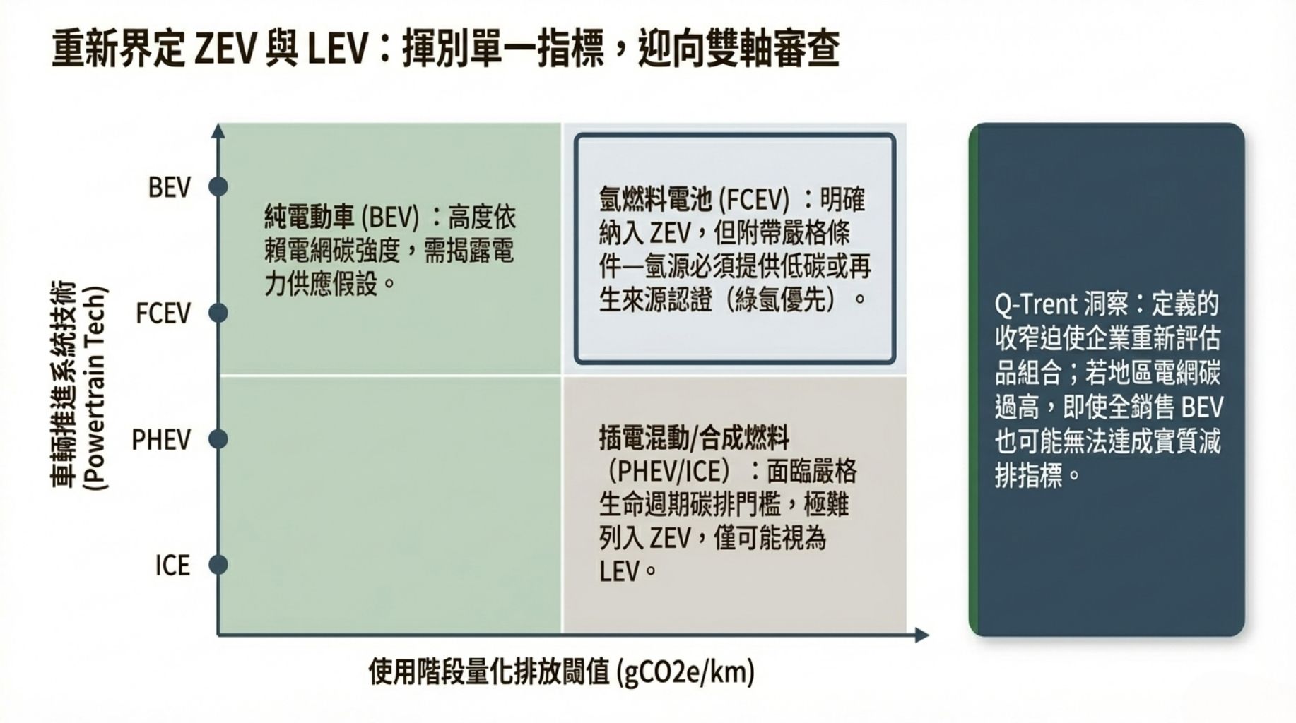 定義的收窄與同時擴展(技術中立但以排放標準為核心)直接改變企業設定淨零路徑時的「可計量供選項」。草案迫使廠商在產品設計與市場策略間做更細緻的成本效益權衡:例如,將某些氫車或高度電氣化車型標為ZEV可提升銷售占比指標,但若該地區電網碳強度高,這些車在使用階段可能無法實質降低排放,造成指標與實際排放之間的脫節 (Ernst & Young (EY), n.d.)。驅勢國際管理顧問 (Q-Trent) 的顧問經驗顯示,企業若不在早期就納入能源來源條件與供應鏈證明,會在後續驗證時面臨重大調整成本 (GreenPulse Consulting, n.d.)。
