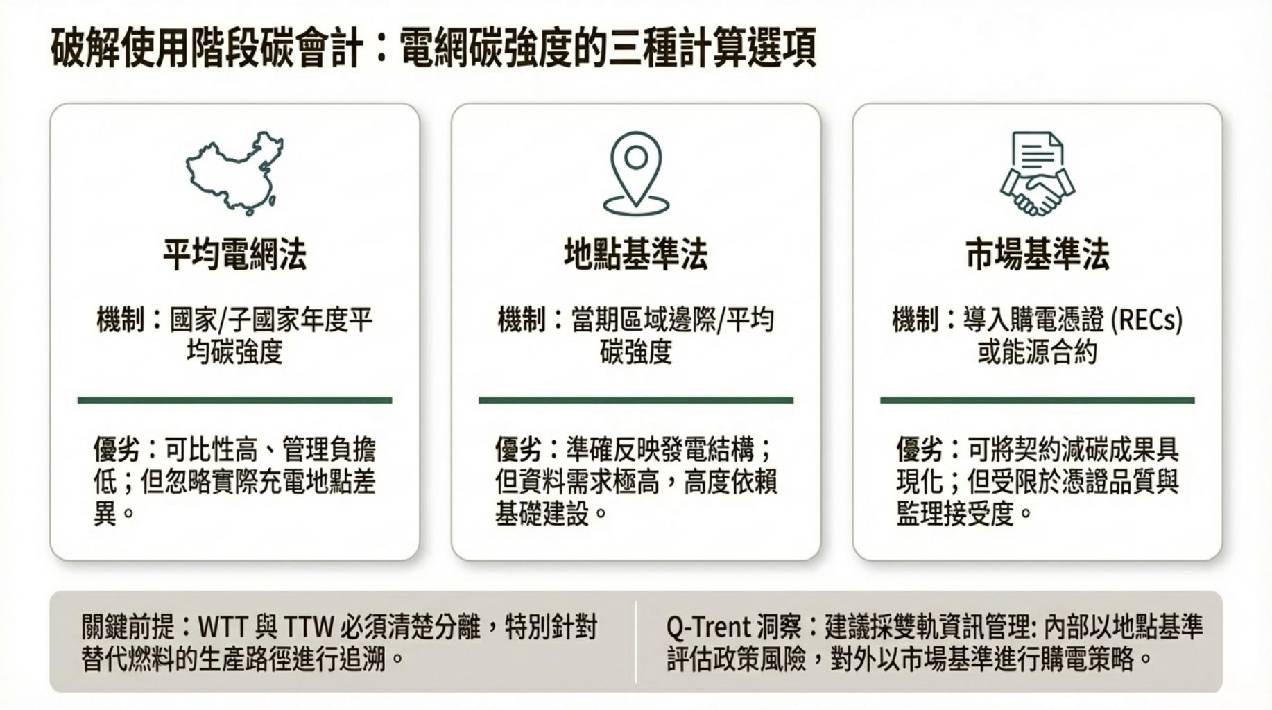 上述三法各有利弊:平均法可比性高但忽略實際充電地點差異;地點法準確但資料需求高;市場法能體現契約減碳但可能受憑證品質與監理接受度影響(Ernst & Young, n.d.)。草案對於電動車會計鼓勵明確披露所採用的方法與假設,以及對數據來源(例如電力流向、時間分配)之驗證路徑(Green Pulse Consulting, n.d.)。驅勢國際管理顧問 (Q-Trent) 建議:若企業在多國經營,應採雙軌資訊管理——以地點基準做內部與政策風險評估,以市場基準做對外宣稱與購電策略匹配。